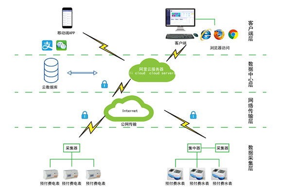 對于分布不同省、地市或同地市不同區(qū)域的連鎖商業(yè)、集團、百貨、門店、物業(yè)、院校等業(yè)務分散,要求集中管理、線上支付,低額提醒、欠費告警。但常規(guī)的本地插卡付費、本地預付費并不能完全滿足客戶管理需求,預付費云平臺應運而生。AcrelCloud-3200水電預付費云平臺無縫集成商業(yè)、物業(yè)公司、集團企業(yè)、院校等分散布置的安科瑞DDSY/ADF系列電子式預付費電能表、閥控智能水表等,提供微信、支付寶、銀聯等可選的在線支付方式,大大方便了用戶充值、圈存,提供預警和充值、退費、電能消耗等記錄查詢,方便用戶和管理方的數據統計和財務分析,提供先交費后使用的管控機制,大大降低了管理部門的收費成本。